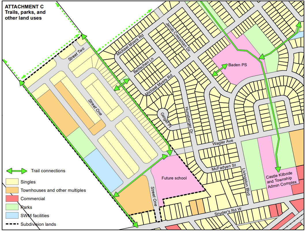 Draft plan of subdivision application 30T-21601, is comprised of approximately 19.57ha and includes between 487 and 631 dwelling units in the form of single detached dwellings, townhomes and other multiple residential buildings. The plan includes a future school block as requested by the Waterloo Catholic District School board, a municipal park, a storm water management area and an integrated trail network that will be interconnected with existing and future sidewalks, trails and walkways.