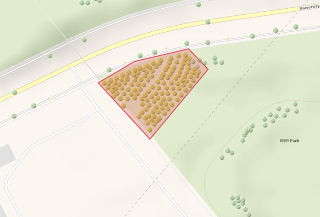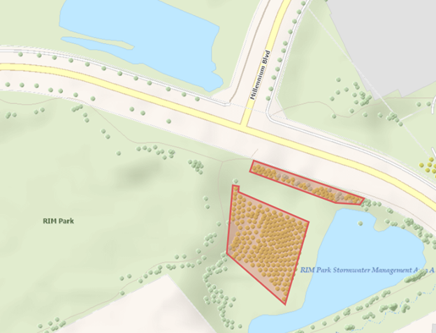 Some of the new trees will create a naturalized area beside RIM Campus Lane. The existing naturalized area will be filled in with trees that can handle occasional wet conditions and expanded toward a nearby grove of basswood and spruce trees.