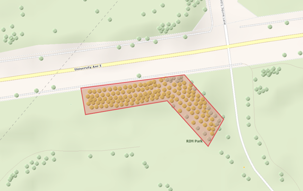 The remaining trees will be used to form a naturalized area along the existing mowed berm. The trees will provide shade to the sports fields and also serve as a buffer from University Avenue East. The area features a slope as well and will link into the existing naturalized berm along Solstice Way.