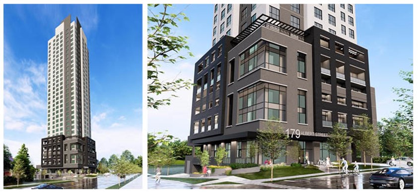 - Setback at grade has been increased to accommodate a larger amenity/open space along the street frontages.
