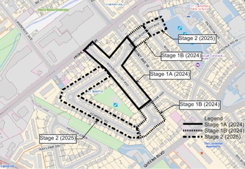 - Stage 1B - Roxborough from Farnham Ave. to Stage 1 limit (access path on Admiral) and Marlborough from Belmont Ave. W. to North Dr.