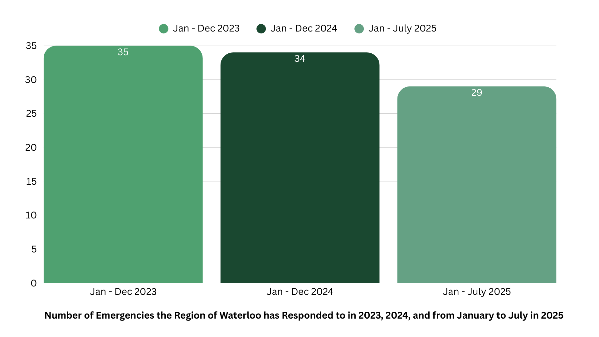 The Region of Waterloo monitors and responds to emergencies across the community. This includes floods, winter storms, extreme heat and cold, air quality impacts from increased wildfire activity Canada wide and more. The chart below captures our responses to climate emergencies plus other events like utility disruptions, gas leaks and security matters. This includes instances of both enhanced monitoring, and small and larger scale emergencies in the community. From January to July this year we have responded to 29 emergencies already.