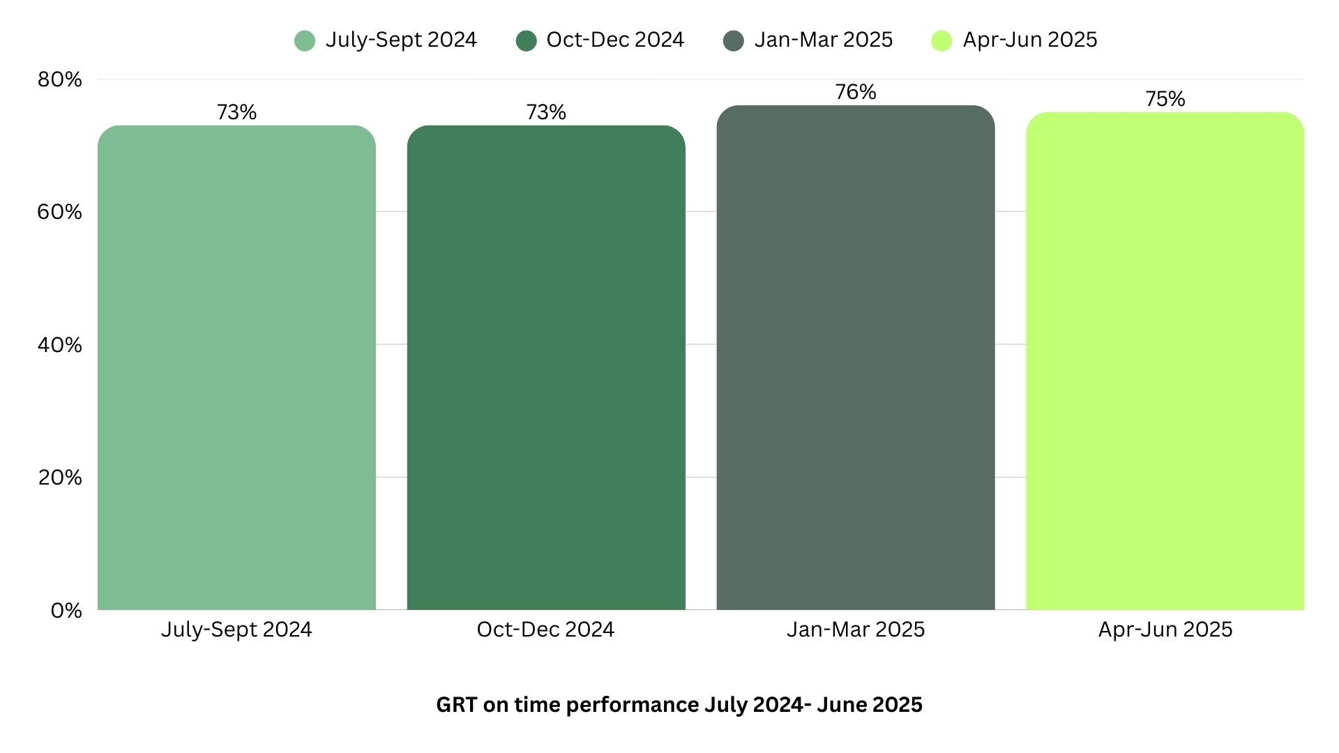 GRT on time performance has remained steady, slightly improving in 2025 compared to 2024.