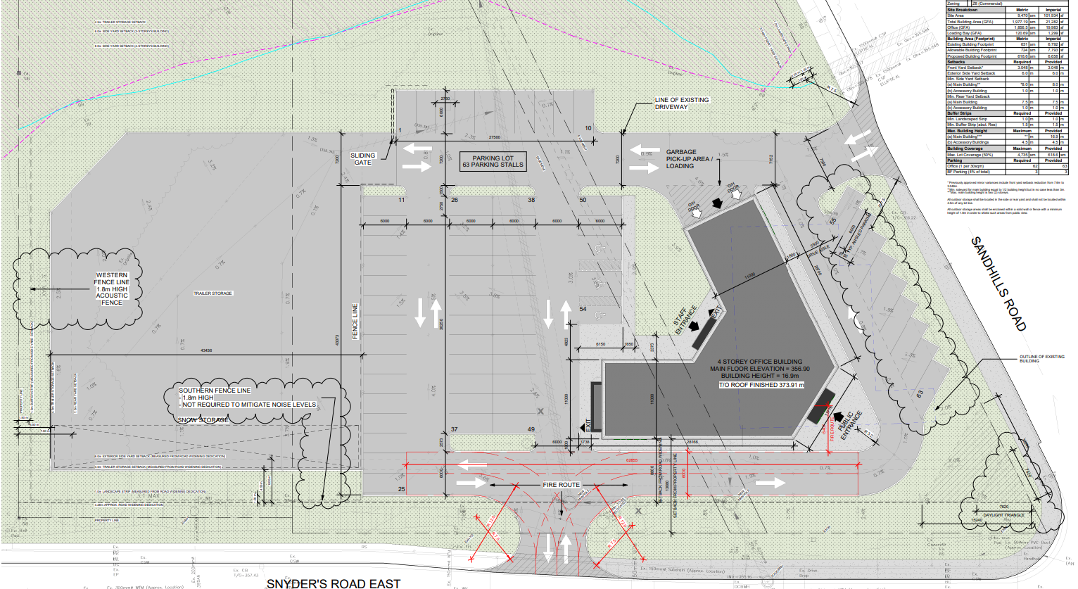 The property is proposed to be redeveloped with a 4-storey office building, associated parking, and a screened storage area. Zoning amendments are required to facilitate this redevelopment as follows: