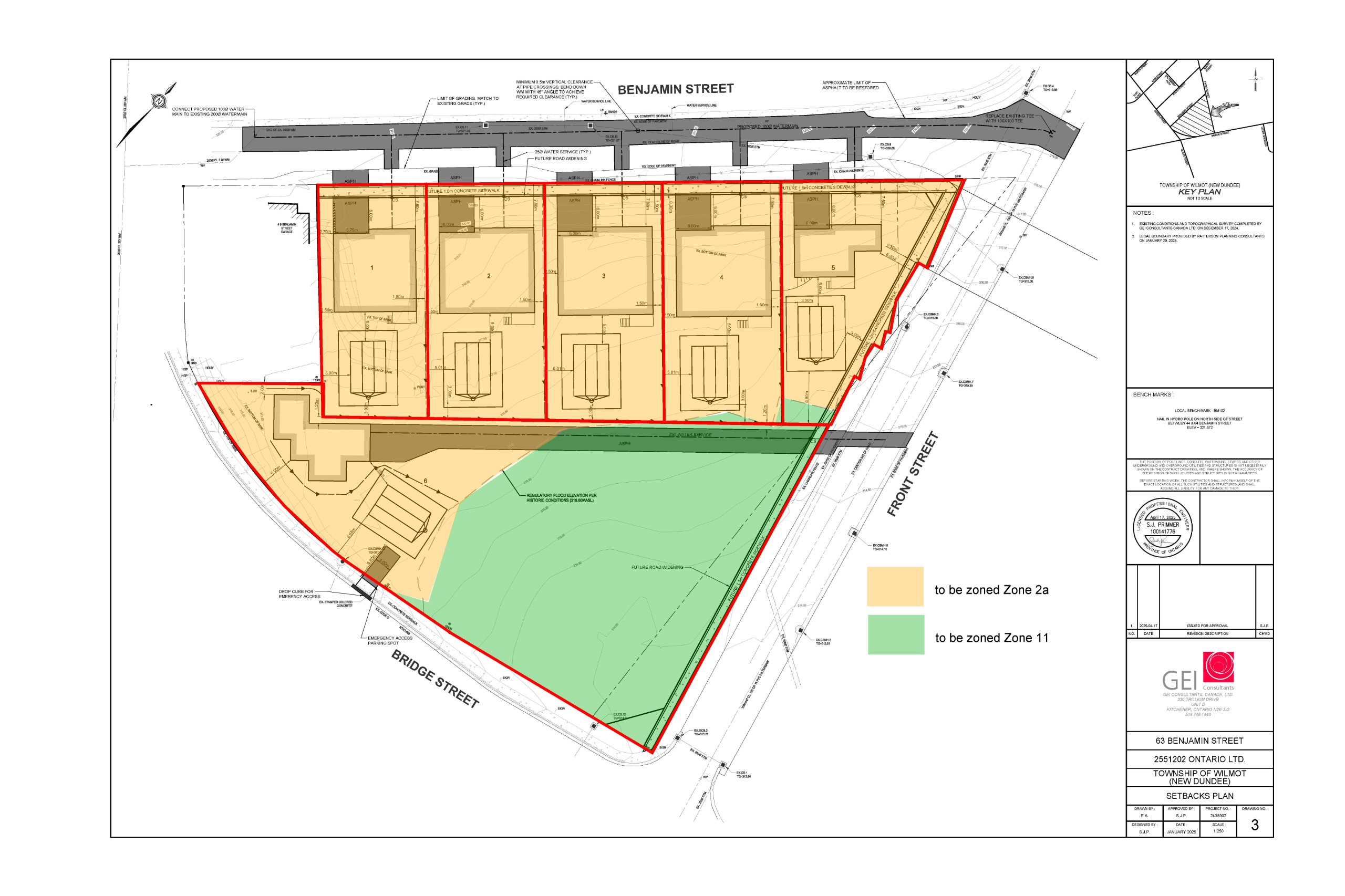 The lands were previously home to the New Dundee Creamery which stopped operating in 1998 with all buildings demolished in 2005. The now vacant property consists of six separately conveyable properties. The application proposes to change the zoning to Zone 2a (Residential) to allow development of the lots with single detached dwellings as opposed to industrial uses presently permitted on the property. Site specific regulations are proposed to recognize the existing lot configurations, to increase the setback to a garage to ensure adequate driveway space should a sidewalk be installed in the future, and to increase one side yard setback to provide adequate space to access the rear yard for septic system maintenance. Lands below the regulatory flood elevation are proposed to be zoned Zone 11 (Open Space).