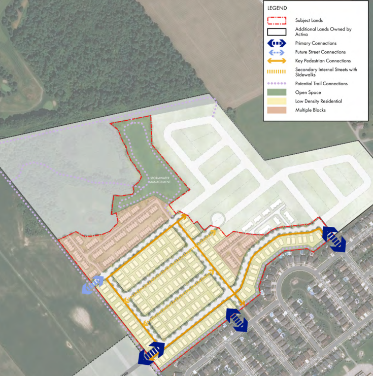 Draft plan of subdivision application 30T-22602 is comprised of approximately 17.97ha and includes between 300-375 dwelling units in the form of single detached and townhouse dwellings. The plan includes a storm water management area and an integrated trail network that will be interconnected with existing and future sidewalks, trails and walkways.