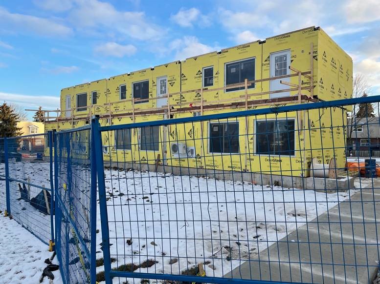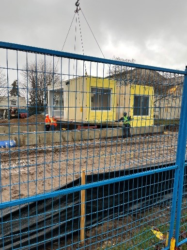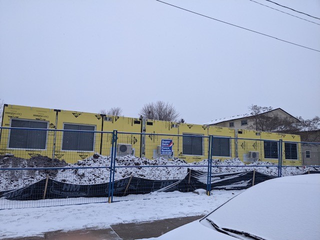 It has been a busy couple of weeks in the development of the six new affordable homes on Bechtel Street. On Monday, December 6, the first nine containers arrived by truck and were moved by a crane into place. These containers make up the three ground floor units. Once in place a layer of concrete was poured on top of the containers for sound and fire protection.