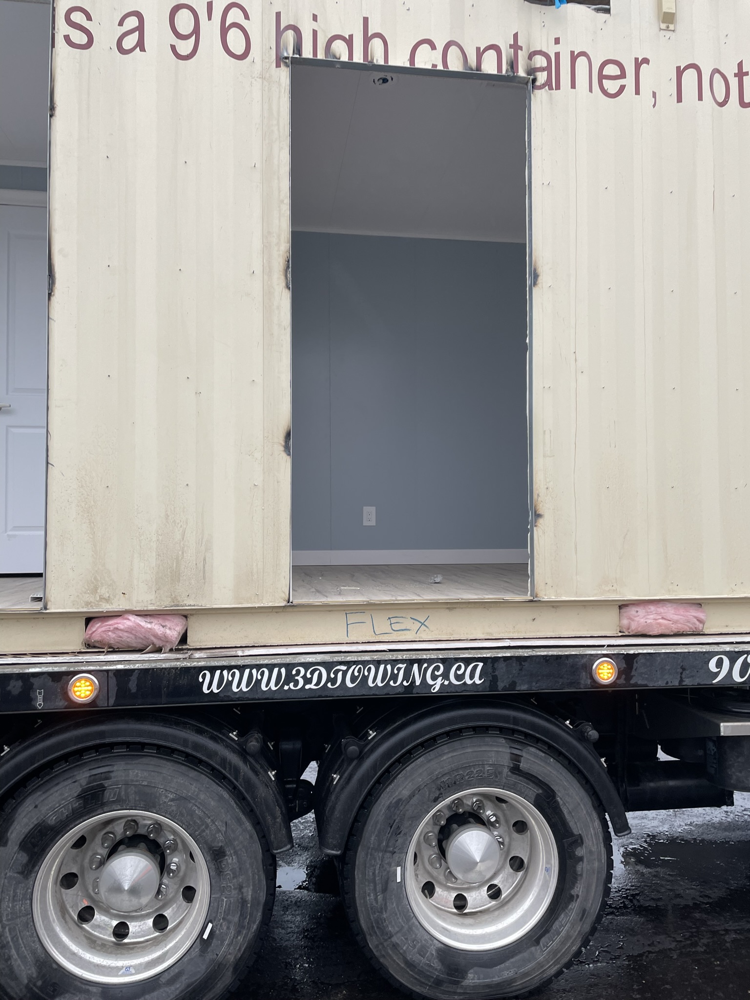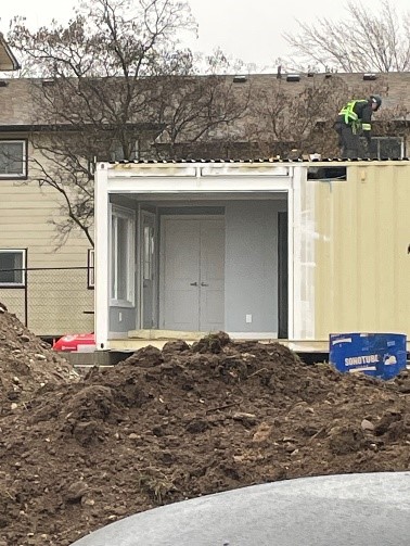 On December 17, the second floor containers arrived and were craned into place. All of the containers arrived fully finished with countertops, flooring, windows and doors. The six soon to be homes for people in our community are now being hooked up to water and electricity services.