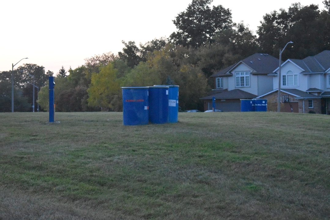 As part of the environmental assessment, all soil and water samples have been collected from the site and the results of their analysis will be sent to the Ministry of Environment, Conservation and Parks for review this week. The review will take four to six weeks. Once it is complete, and if no additional samples are needed, the Ministry will deem the property safe for housing development and a notice of this will be made public. The blue barrels on the site are the storage containers for the samples. They will be removed from the site as soon as the Ministry finishes its review.