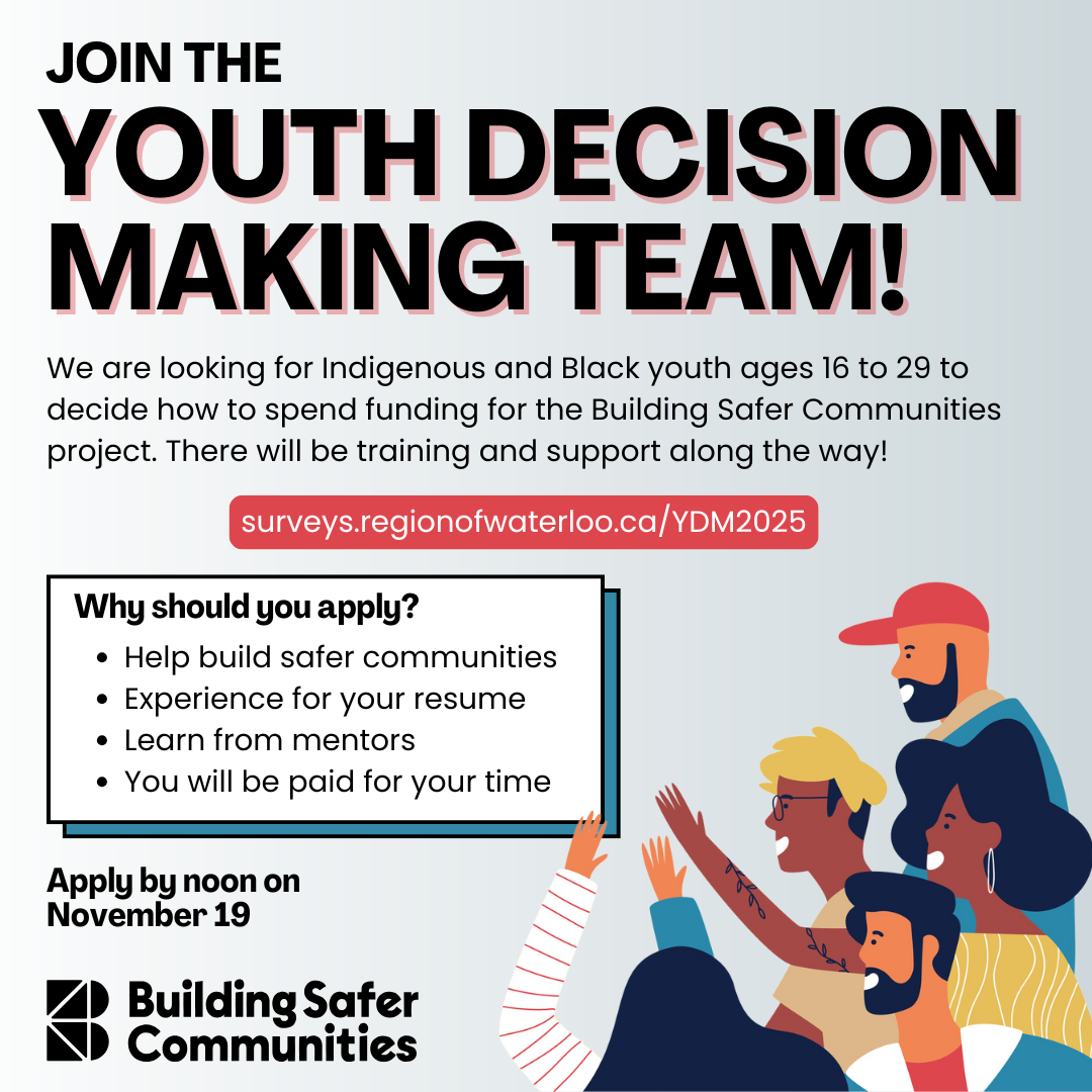 We are looking for youth from Waterloo Region to join the Building Safer Communities Youth Decision Making Team!