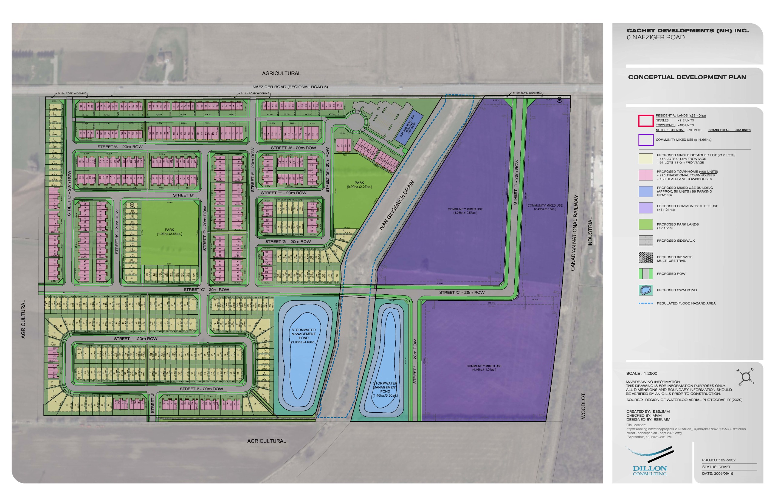 2. Draft plan of subdivision application 30T-24601 is comprised of approximately 43.07ha and includes approximately 667 residential units in the form of single detached dwellings, townhomes and other multiple residential buildings. Three commercial/light industrial development blocks are proposed for the lands between the CN railway and the Ivan Gingerich Drain. The plan includes storm water management areas, open space areas, parkland and an integrated trail network that will be interconnected with existing and future sidewalks, trails and walkways.