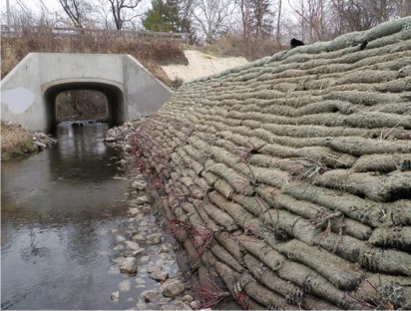 Soft armouring techniques such as a “living wall” can be used to reinforce the slope and provide erosion protection in areas where there is sufficient space and less risk to public safety or flooding. In some parts of the study area, tree cover over portions of the creek might make it difficult to grow vegetation on the slope. In those areas we would use appropriate grass seed mix and plants that thrive in partial sun or shaded areas.