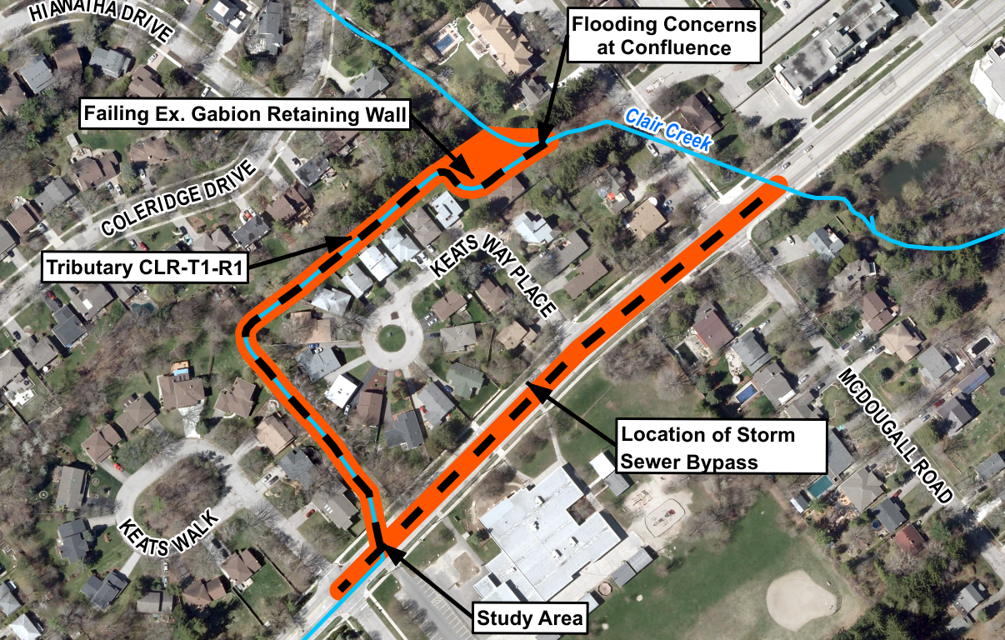 The section of Clair Creek from Keats Way to McDougall Road is defined as “a confined channel with gabion basket bank treatments”. The existing municipal storm sewer on Keats Way, west of Keats Walk, discharges to a tributary via a culvert and flows around the existing residential properties on Keats Way Place. The tributary ultimately meets with Clair Creek, west of McDougall Avenue.