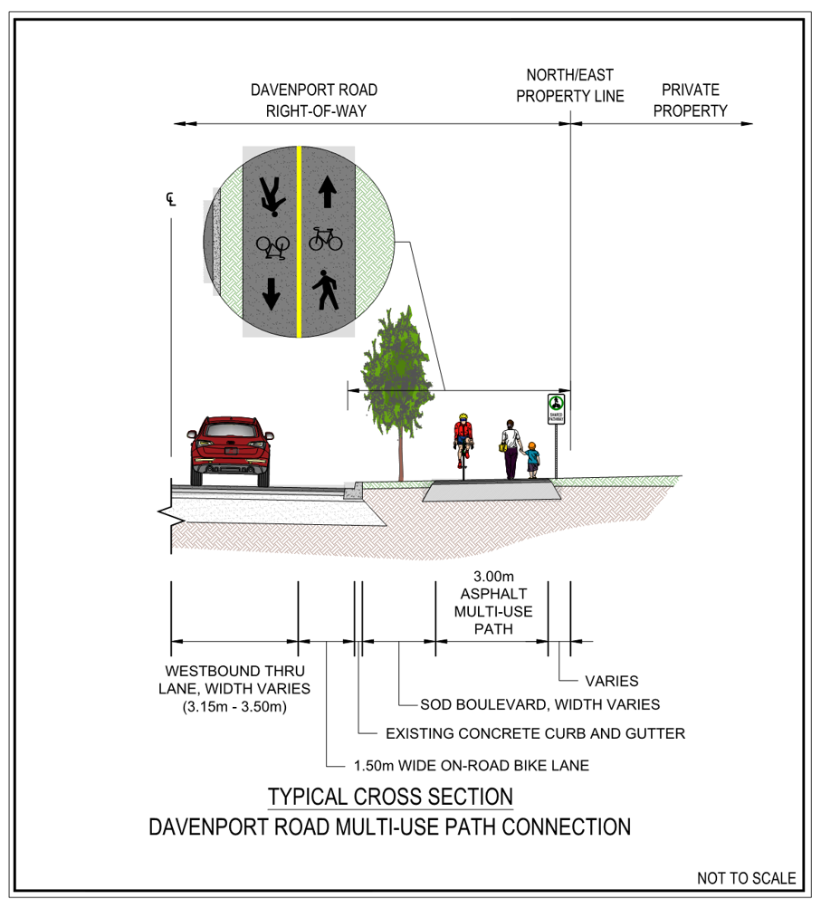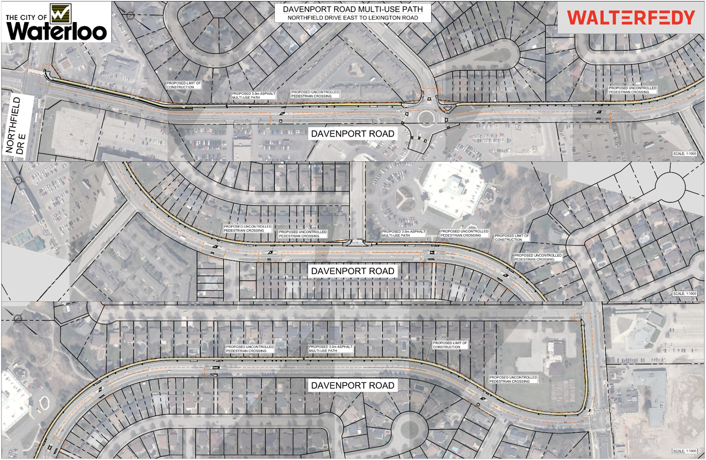 The existing eastside sidewalk on Davenport will be replaced with a wider asphalt multi-use path (MUP). Similarly, the north sidewalk on Lexington Road between Davenport and Anndale. The MUP will connect to other existing paths and the broader active transportation network.