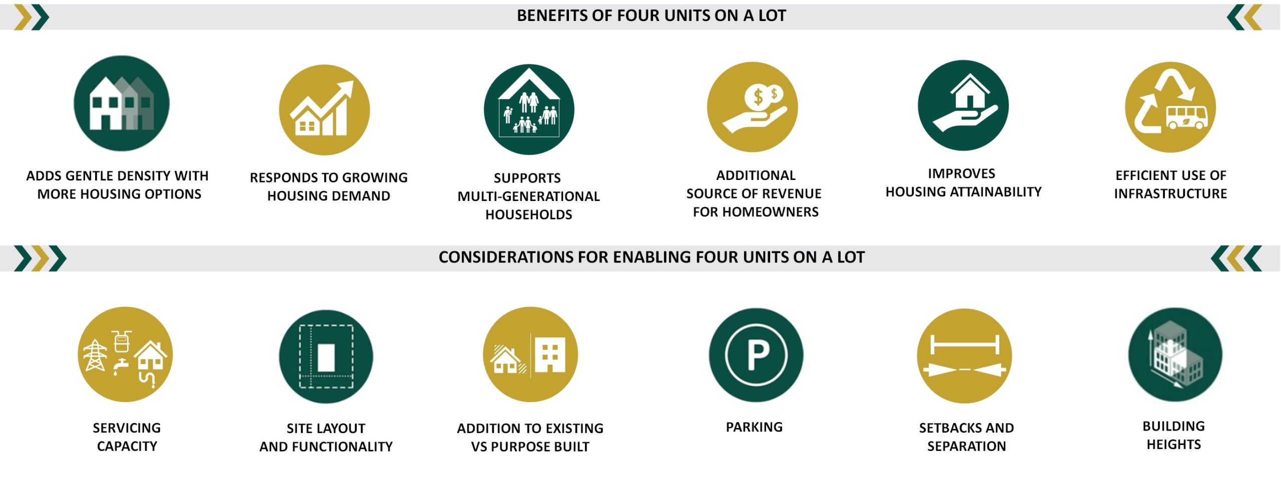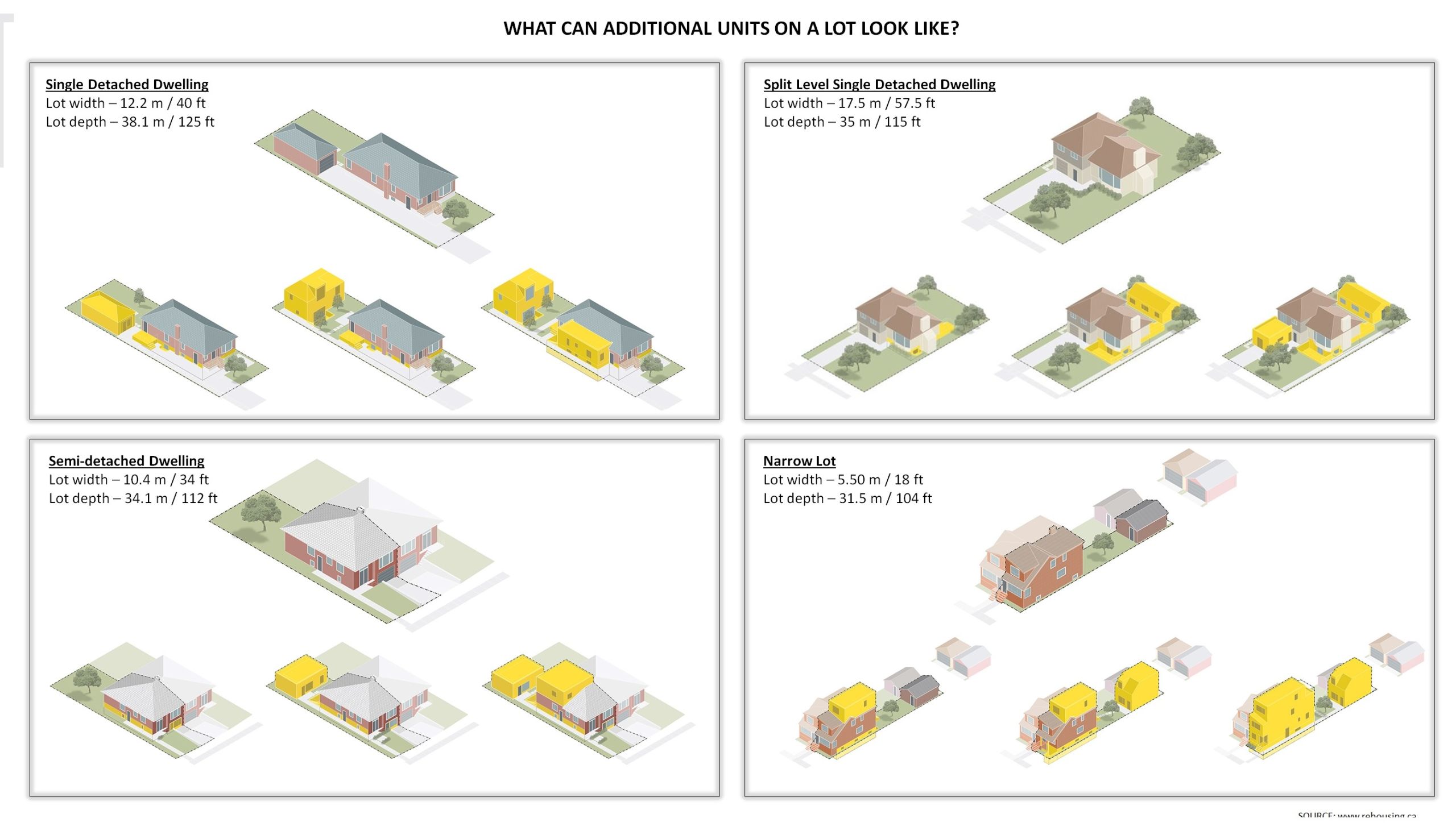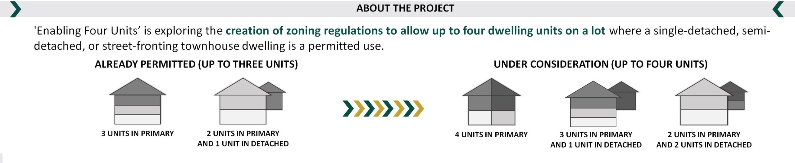 'Enabling Four Units’ is exploring the creation of zoning regulations to allow up to four dwelling units on a lot where a single-detached, semi-detached, or street-fronting townhouse dwelling is a permitted use.