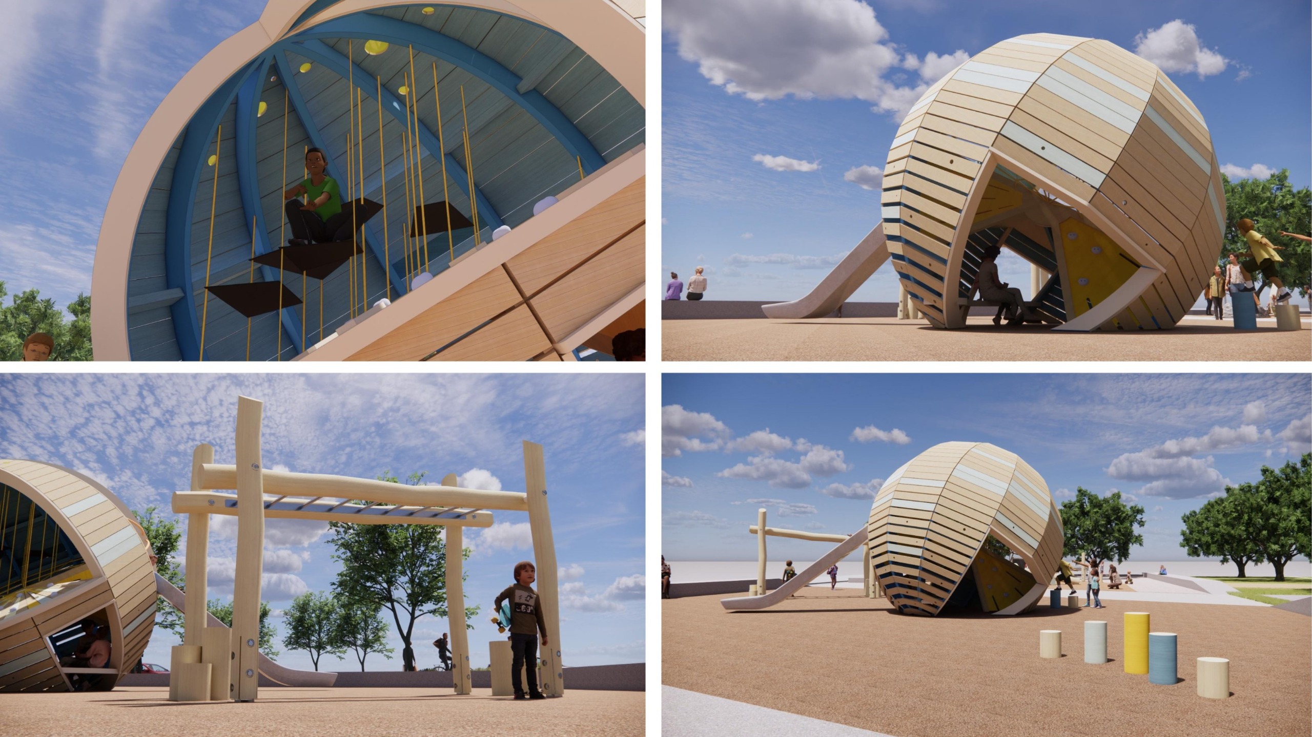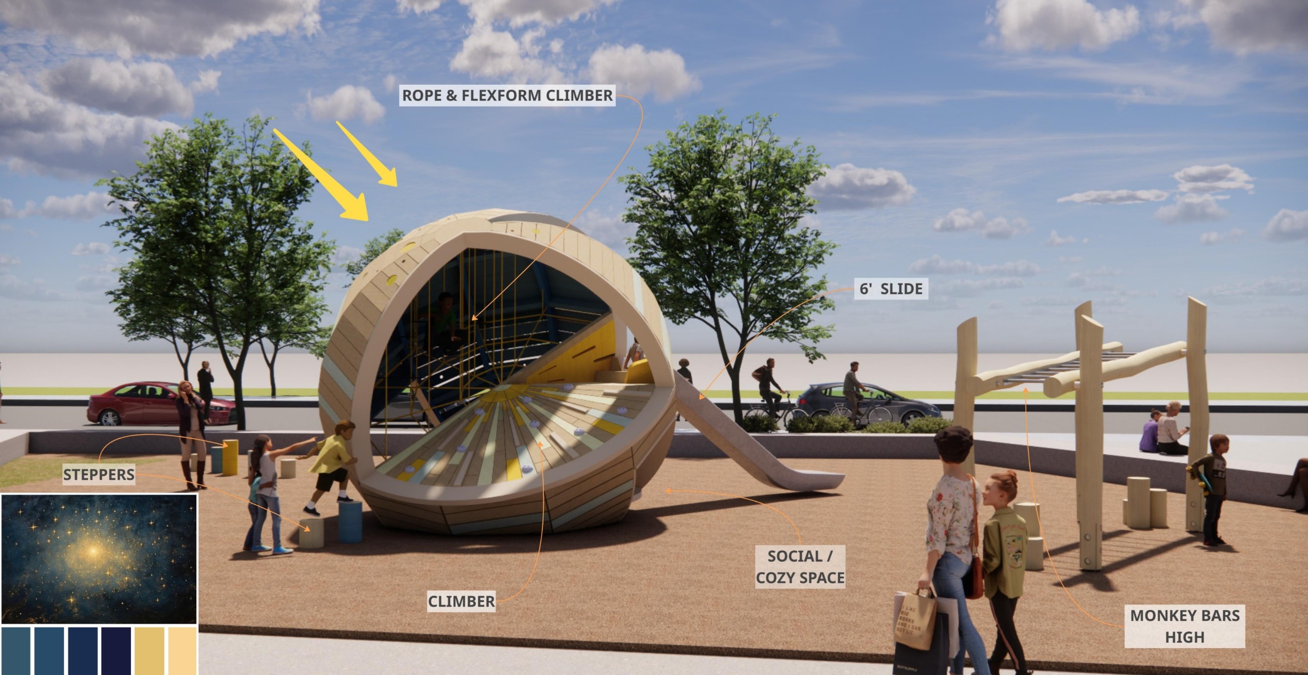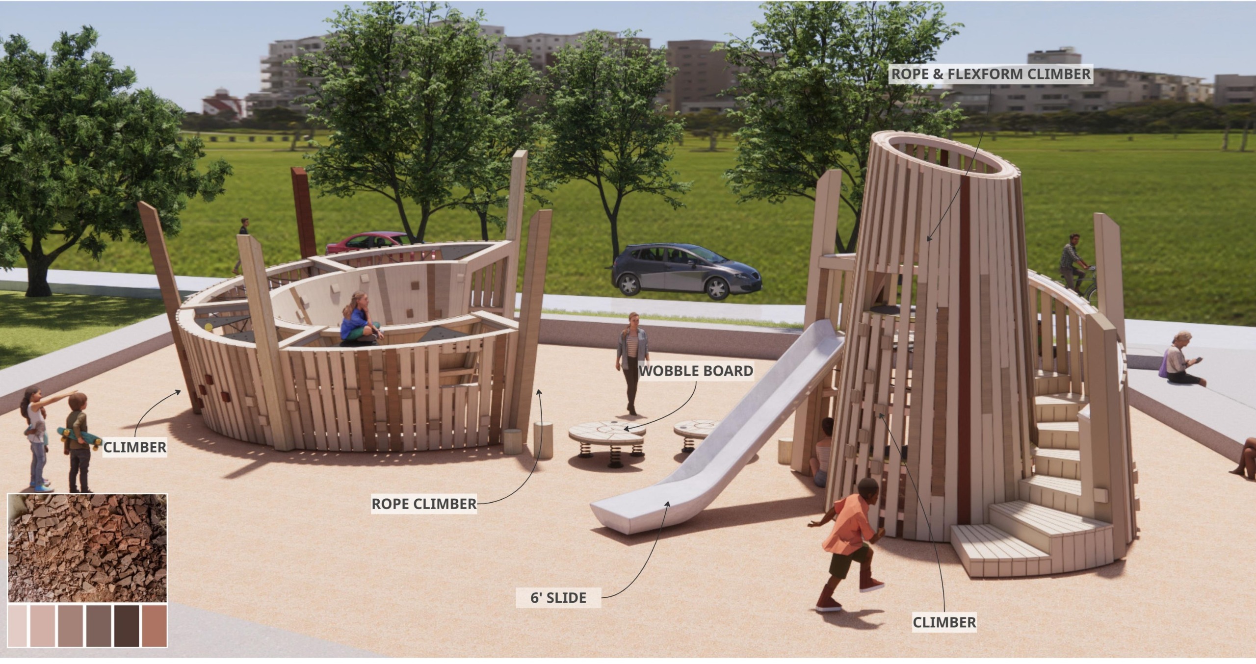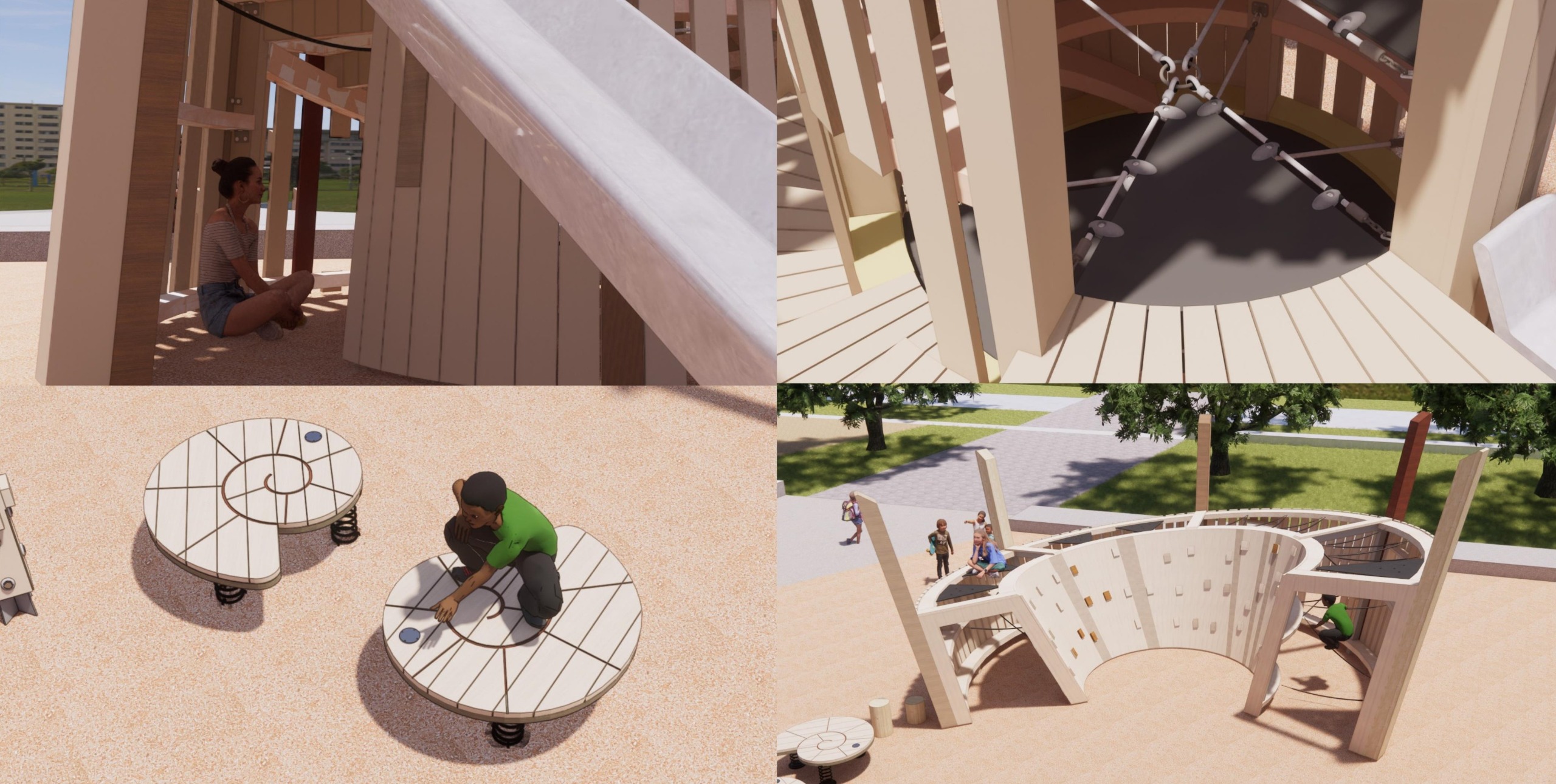 This concept features a tower, a coliseum, wobble boards and individual steppers within an engineered wood fibre area. The tower includes a slide, various climbers, ropes and flexform elements, along with a cozy social space for interaction. The coliseum will offer additional climbing opportunities, rope-based challenges and its own inviting social area.