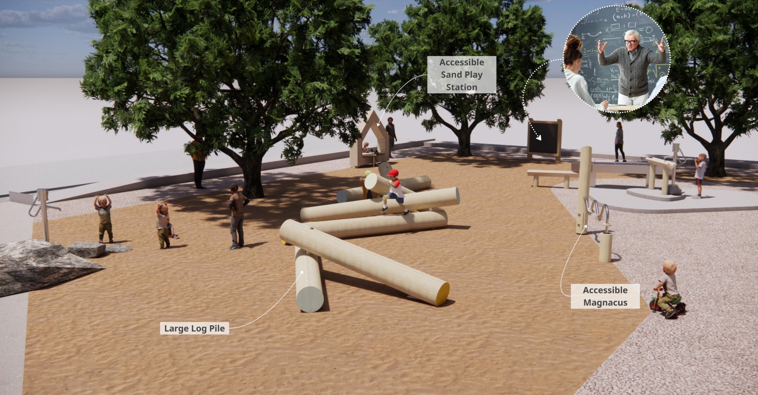 The sand area in this concept has two water pumps, water troughs and channels, two accessible sand play stations, a discovery wheel, a discovery table, a log pile and hidden fossil elements to encourage imaginative and exploratory play.