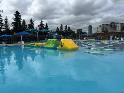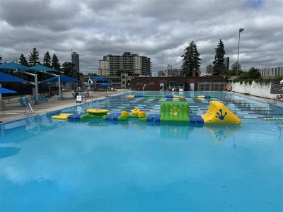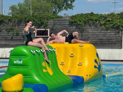 This summer you’ll see new small pieces like floating mats, a raft, and pool balls. We also purchased two Wibits, inflatable play structures that float on the water (like bouncy castles for the pool!). One is for the deep end, one for the shallow end, available on warm and sunny Saturdays, Sundays, and special events. Check out the photos below.