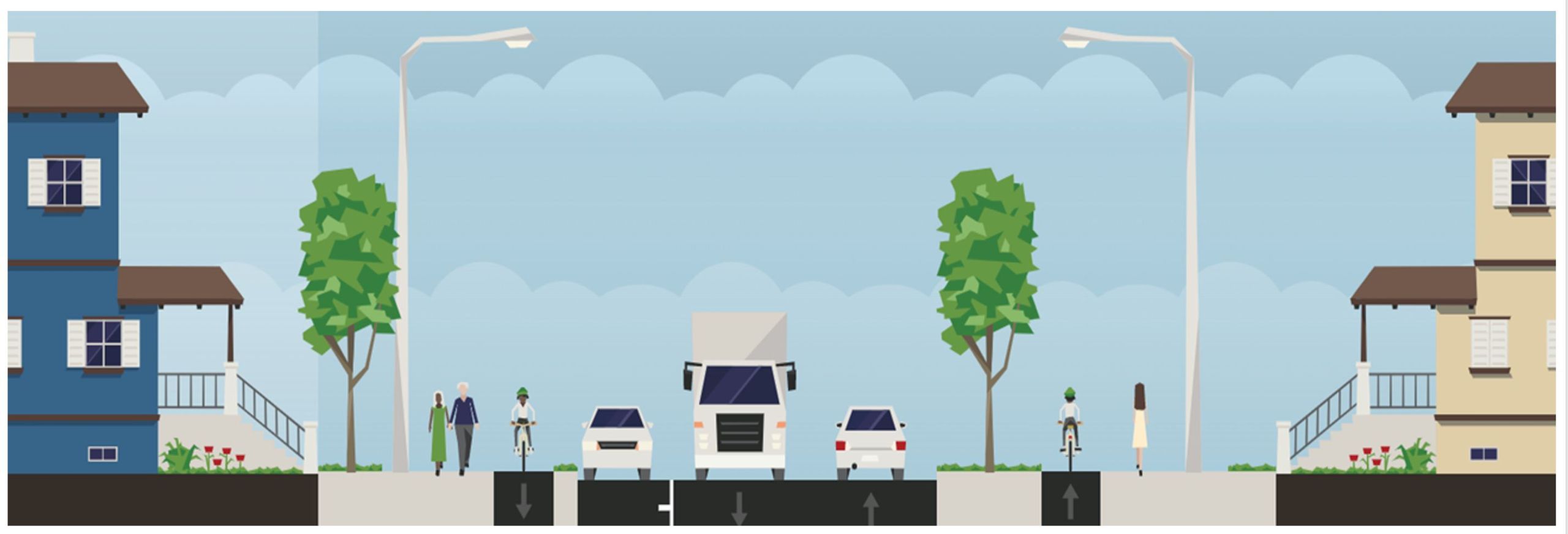 • Addition of cycle tracks, as directed by the city’s Cycling and Trails Master Plan (2021). Cycle tracks are outside of the roadway and separated by a barrier curb directly beside the sidewalk. They are attractive to all ages and abilities, due to the strong separation from motor vehicles.