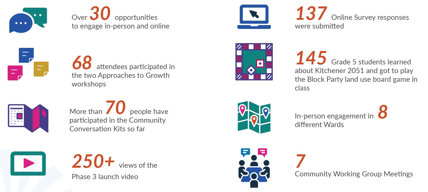 The project team also conducted interviews with key City staff from across multiple departments to share information about the Kitchener 2051 process, learn about recent City initiatives, processes, and outcomes, and to identify potential audiences, community concerns, dynamics, and engagement gaps.
