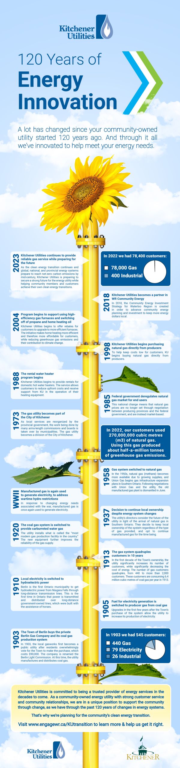 Kitchener Utilities is committed to being a trusted provider of energy services in the decades to come. As a community-owned energy utility with strong customer service and community relationships, we are in a unique position to support the community through change, as we have through the past 120 years of changes in energy systems.