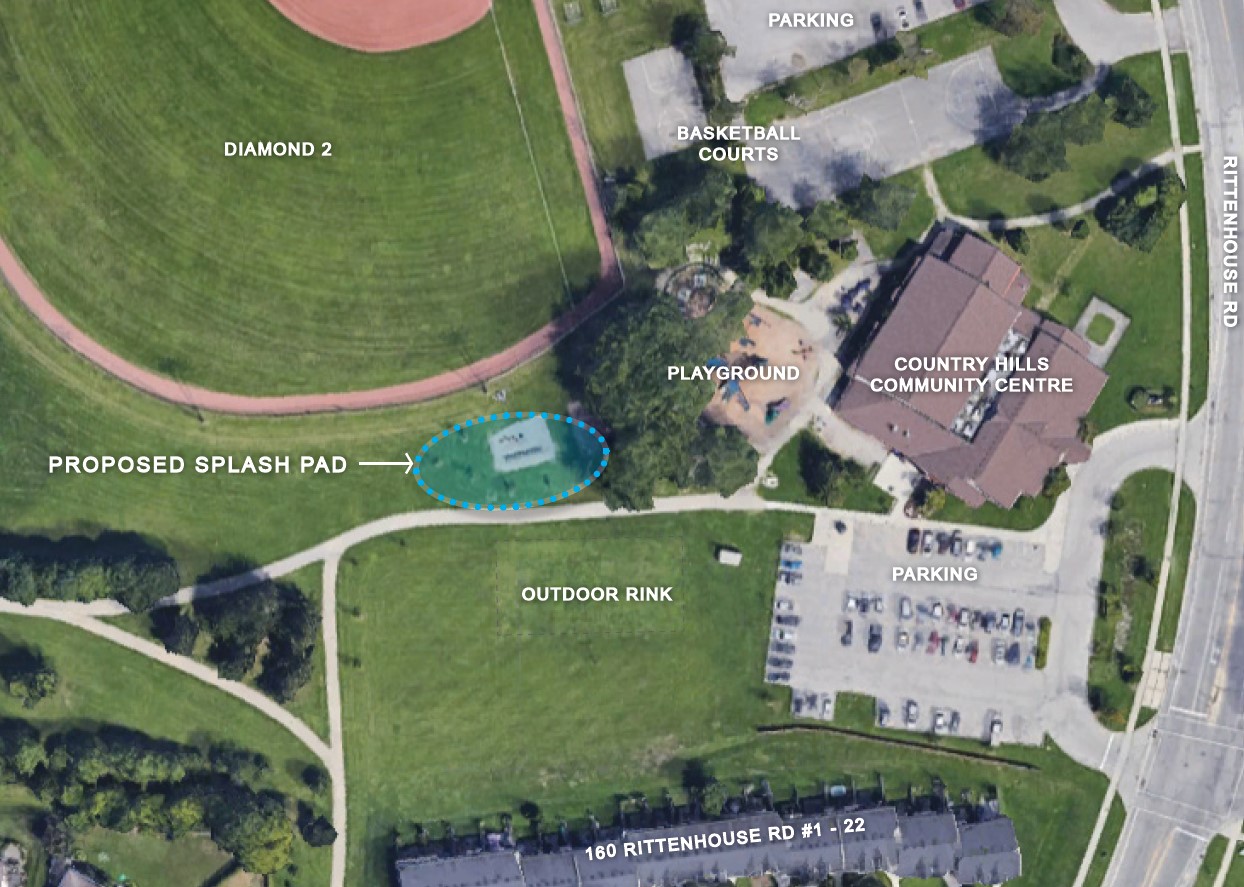 The splash pad is between ball diamond 2, the playground, and the outdoor rink.