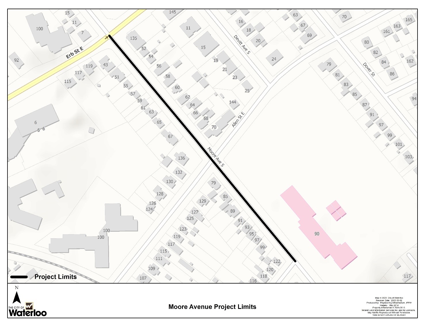 The City of Waterloo has approved the reconstruction of Moore Avenue South from Erb Street East to John Street, with construction scheduled to start in the Spring of 2024. The City has selected GM BluePlan Engineering Limited to provide design and contract administration services for the reconstruction project. The map below shows the approximate limits of reconstruction.