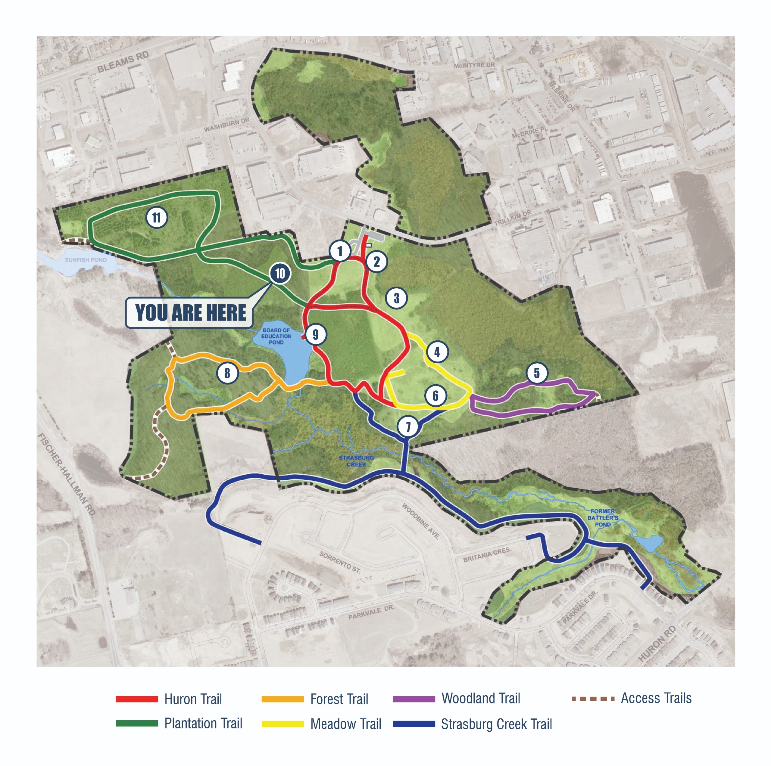 Along the Plantation Trail at Huron Natural Area reveals a story from recent history. Initially, European settlers used this land for farming, and old foundations from former farm buildings are still visible. After the farms were abandoned, a large project in the 1950s planted rows of pine trees on the empty fields. A walk on this trail shows the history of both the old farms and the forest planted as a replacement.