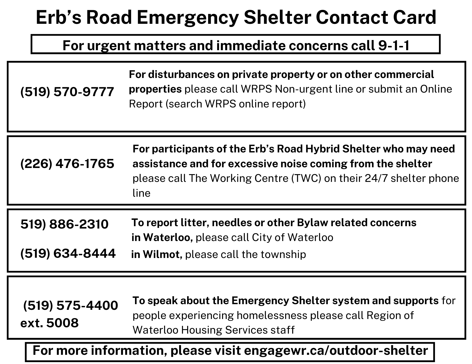 TWC will be implementing a Good Neighbour Policy to effectively address behaviours and accountability of the shelter participants. Please refer to the contact card for more details on who to call for issues. Please continue to report any crimes to WRPS directly.