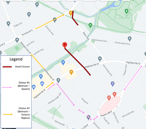 Detour Map during Highland Rd W Intersection Closure starting on/about June 6, 2023