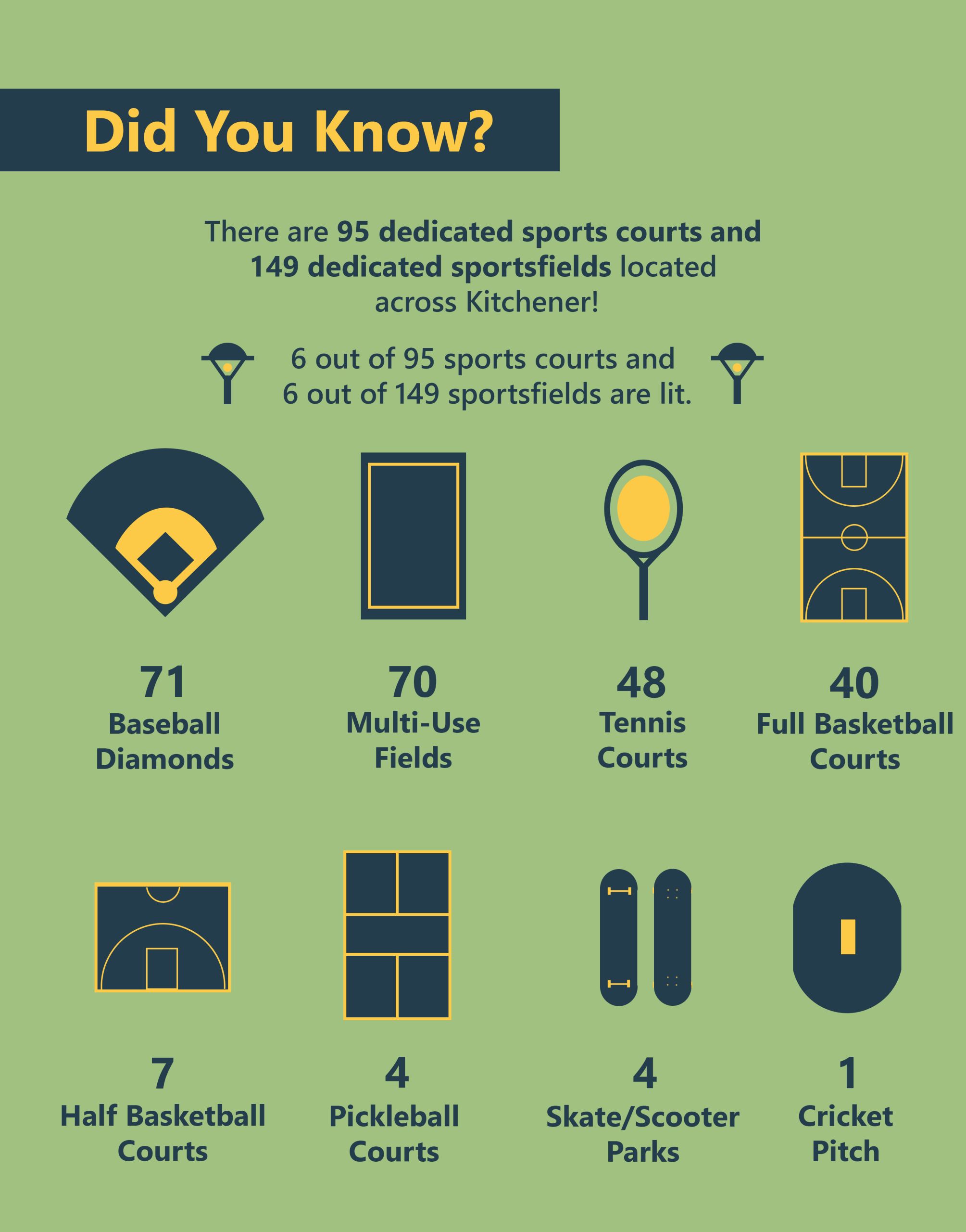 There are 95 dedicated sports courts and 149 dedicated sports fields located across Kitchener!