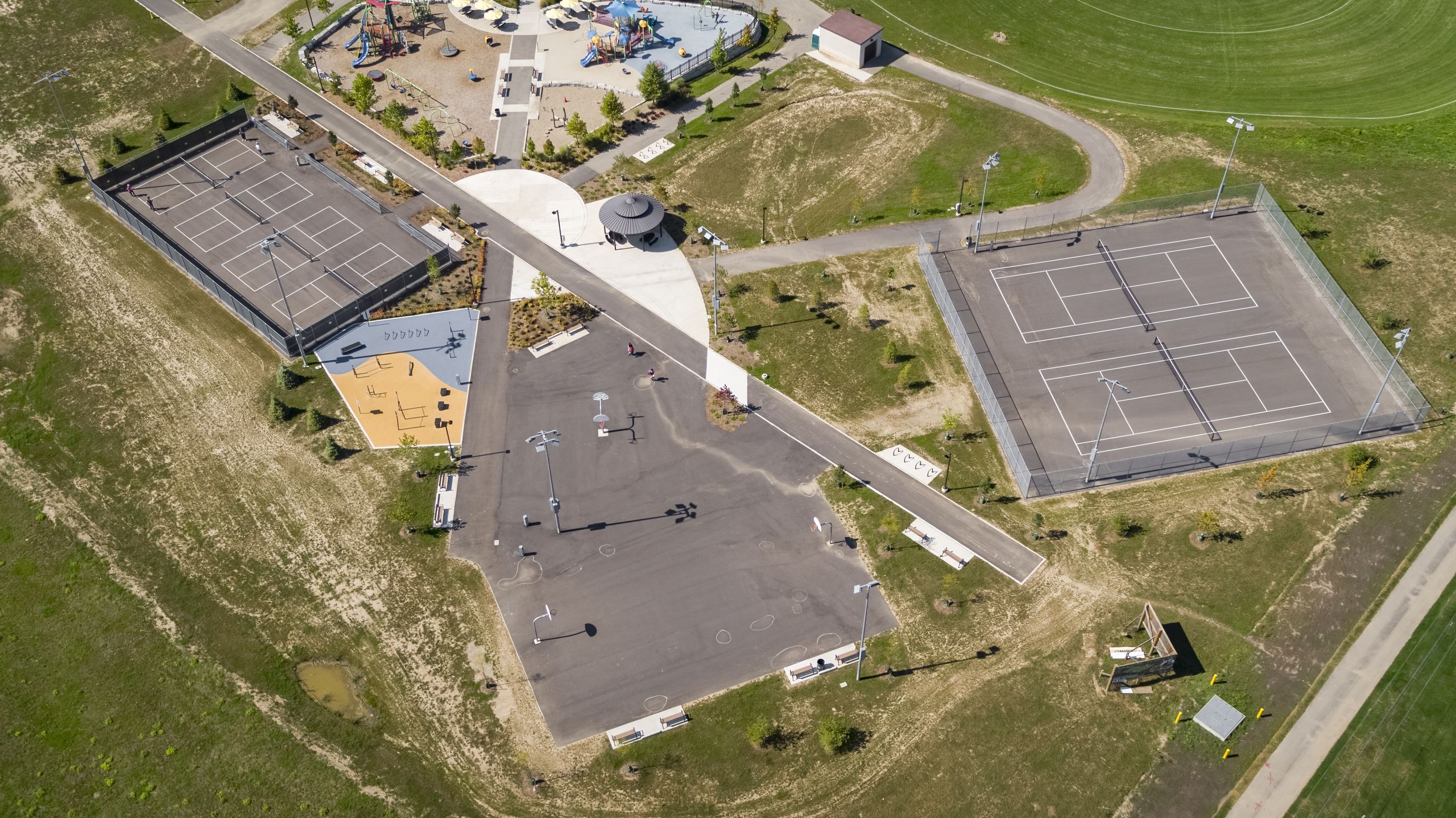 In case you missed it, the courts at RBJ Schlegel Park have been re-opened for the remainder of the fall and winter season. The tennis court has been completed. The basketball and pickleball courts have been prepared but final coating was not able to be installed. This will be scheduled for early spring as soon as temperatures allow. Here is a drone shot we took when they were first completed and painted in the summer.