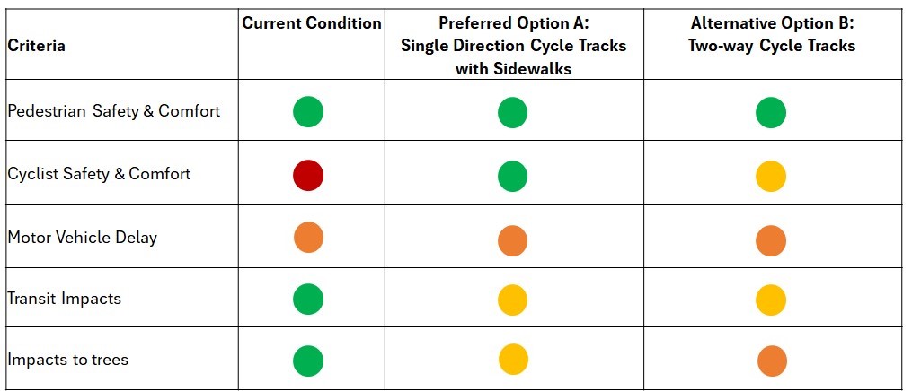 We assessed Wilson Avenue's current condition and both design options based on these criteria: