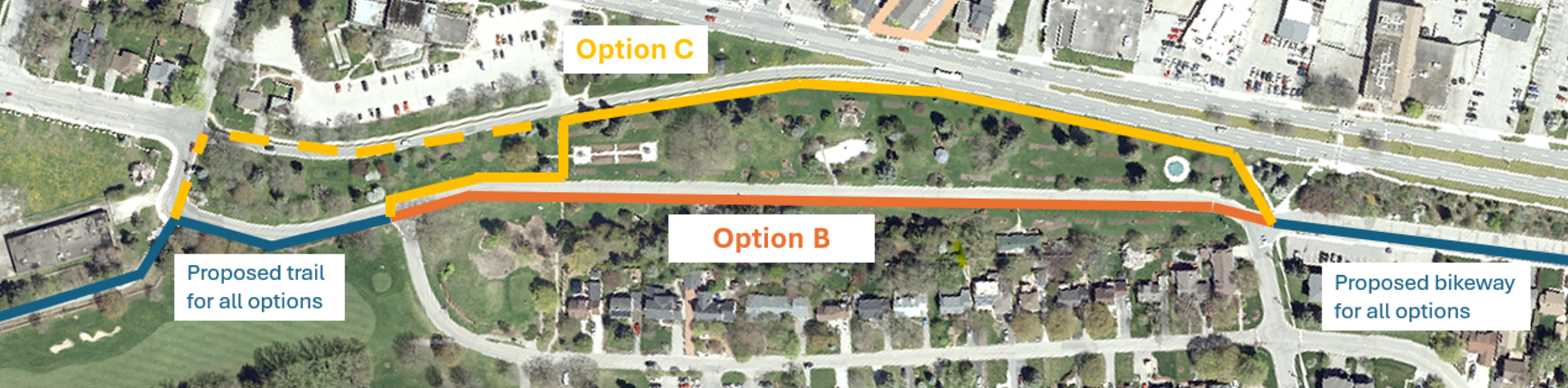 Map showing the pathways for each option, plus the proposed trail and bikeway for all three options.