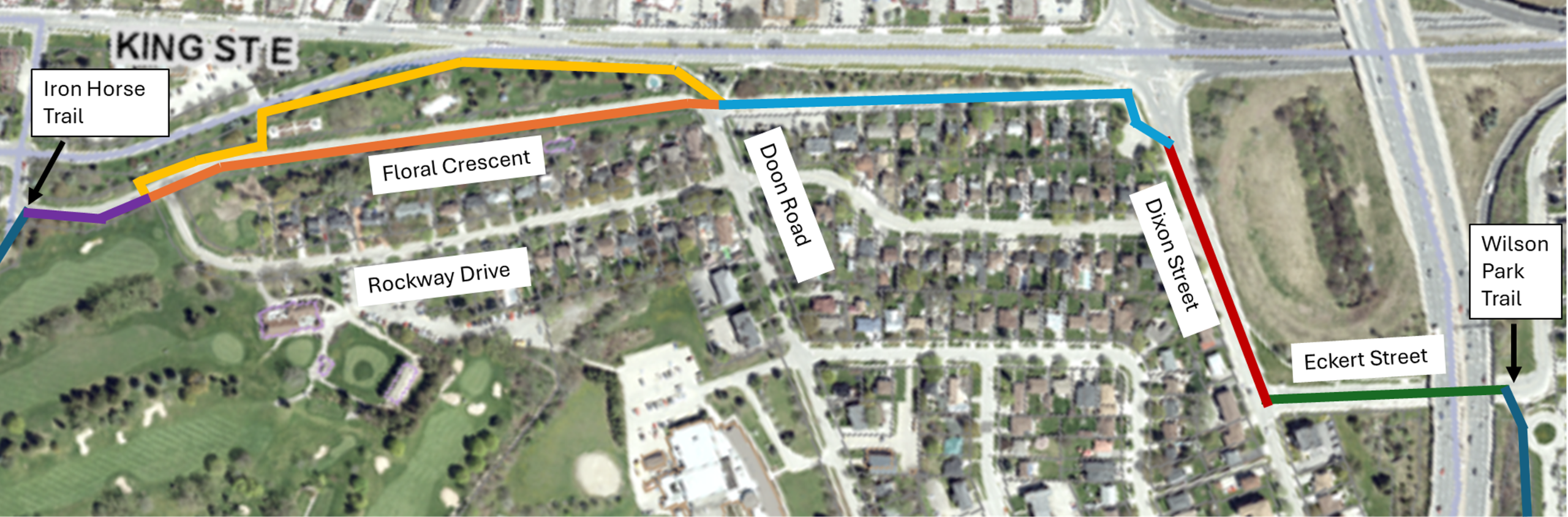 • 3m multi-use path would continue on Floral Crescent to Doon Road, for the use of people walking, rolling and cycling
