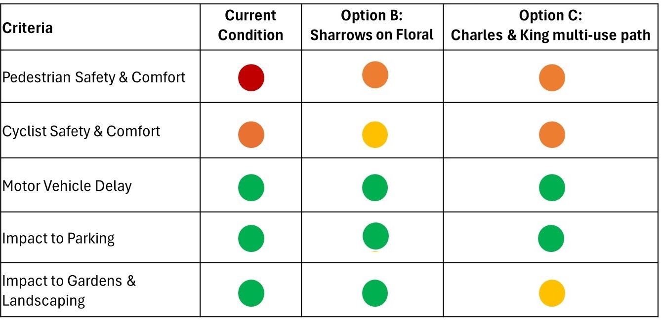 We assessed Floral Crescent's current condition and the design options based on these criteria: