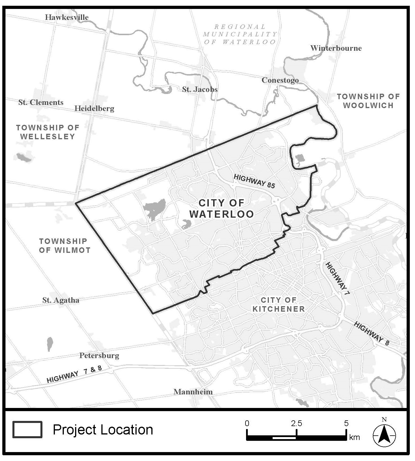 The City of Waterloo is undertaking an Addendum to the existing 2015 Waterloo Sanitary Master Plan. The purpose of this Addendum is to examine the City’s infrastructure needs considering new planning policies, growth projections and the current needs and issues that exist in our community. The Integrated Sanitary Master Plan will review improvements to existing sanitary infrastructure, the installation of new sanitary infrastructure, and consideration of private services to municipal servicing, through to the year 2051. The Study is being undertaken within the City limits, as shown on the map.