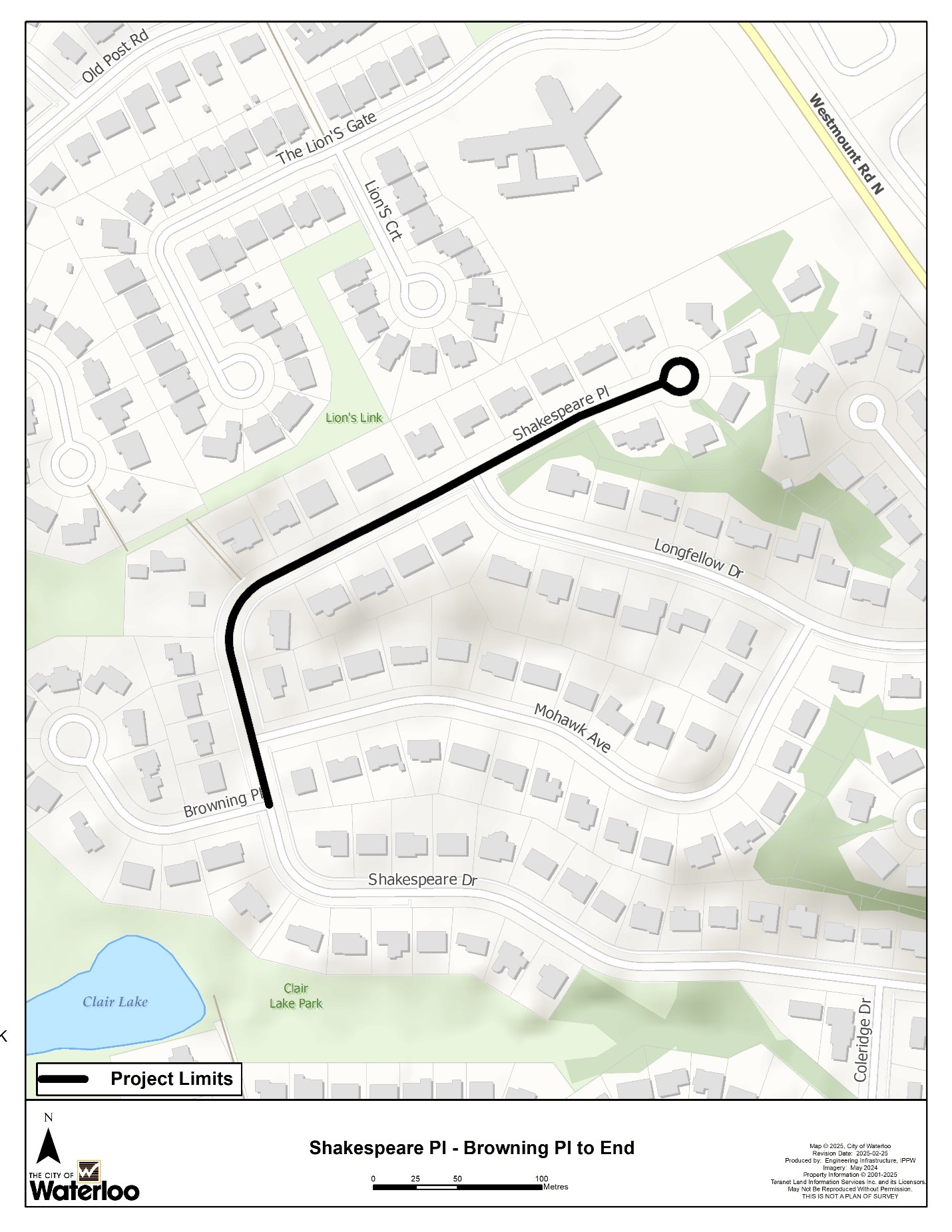 The City of Waterloo has approved the reconstruction of Shakespeare Drive (Browning Place to cul-de-sac on Shakespeare Place), with construction scheduled to start in the Spring of 2026. The City has selected GEI Consultants to provide design and contract administration services for the reconstruction project. The map below shows the approximate limits of reconstruction.