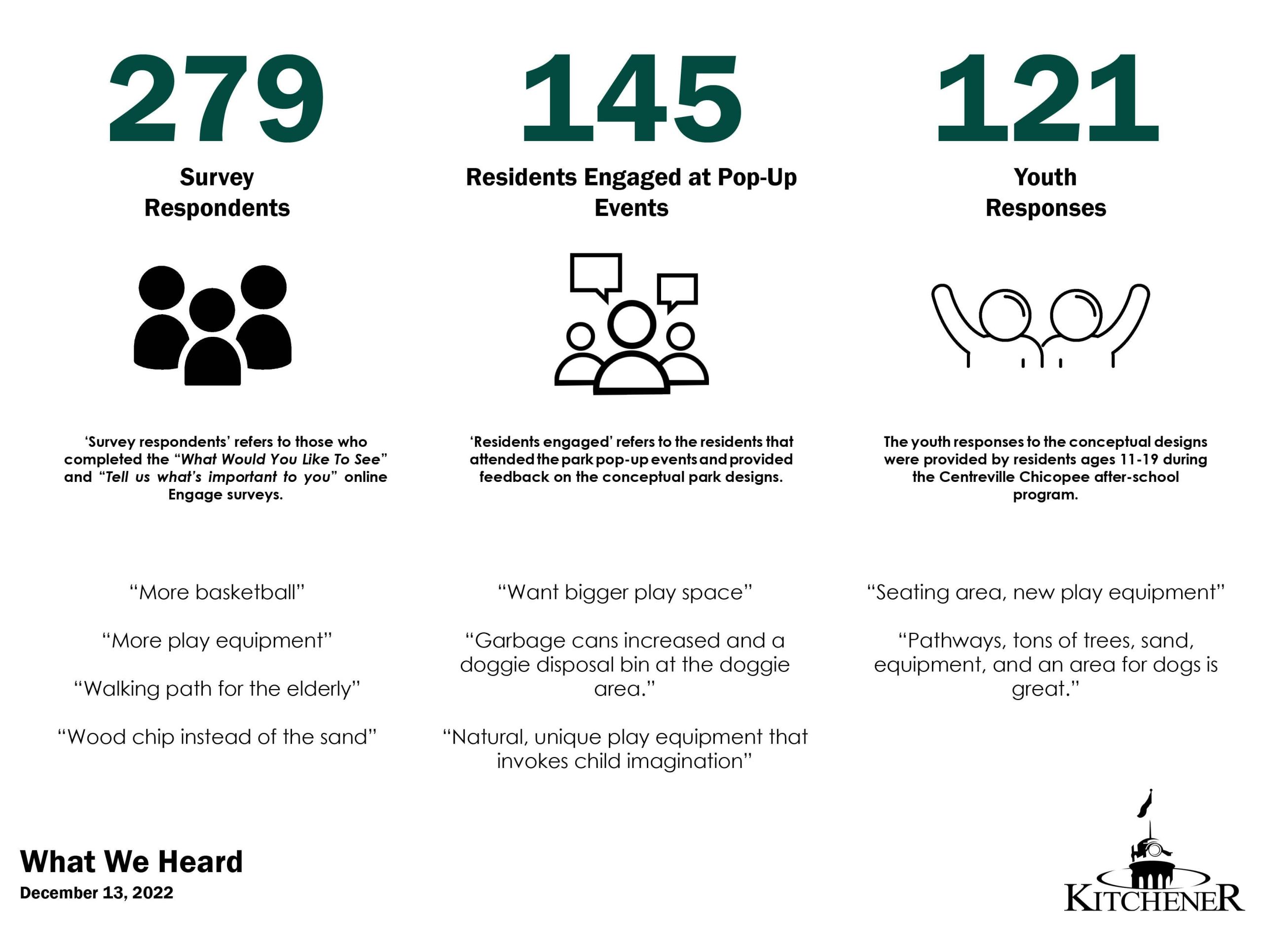 • 145 residents attended park pop-up events and provided feedback on the conceptual park designs