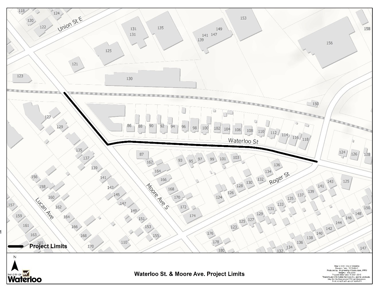 The City of Waterloo has approved the reconstruction of Waterloo Street (Moore Ave S to Roger St) and part of Moore Avenue South (Waterloo St to train tracks) with construction scheduled to start in the Spring of 2024. The City has selected GM BluePlan Engineering Limited to provide design and contract administration services for the reconstruction project. The map below shows the approximate limits of reconstruction.