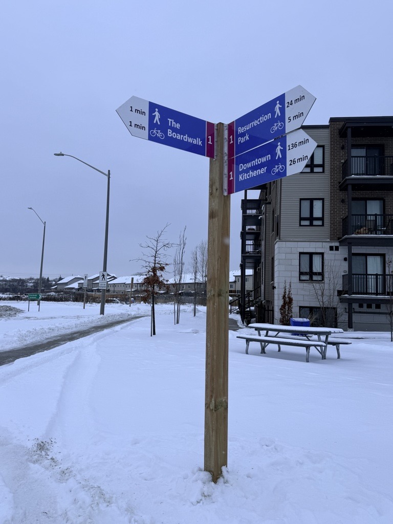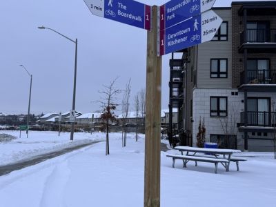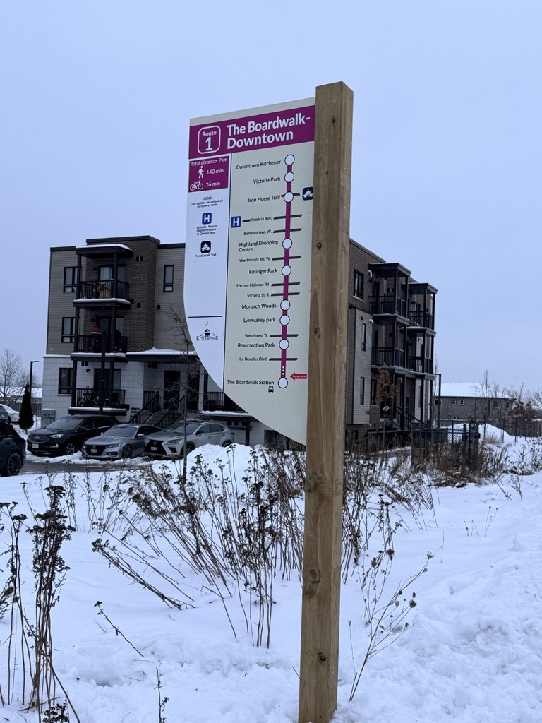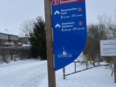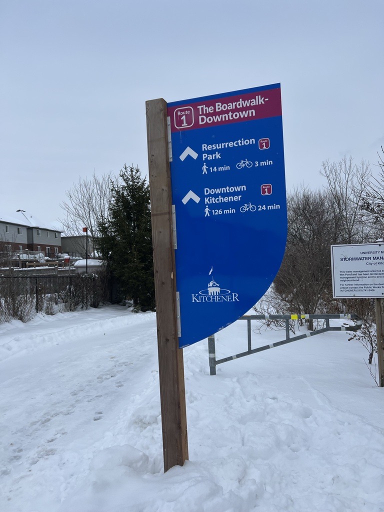 You may have noticed signs being installed between The Boardwalk and Downtown Kitchener. We’re almost done Route 1! Due to the early winter, some aspects of Route 1 have been deferred to the spring. The full route will be open to users in the spring. Stay tuned for information on an official opening to celebrate this occasion.
