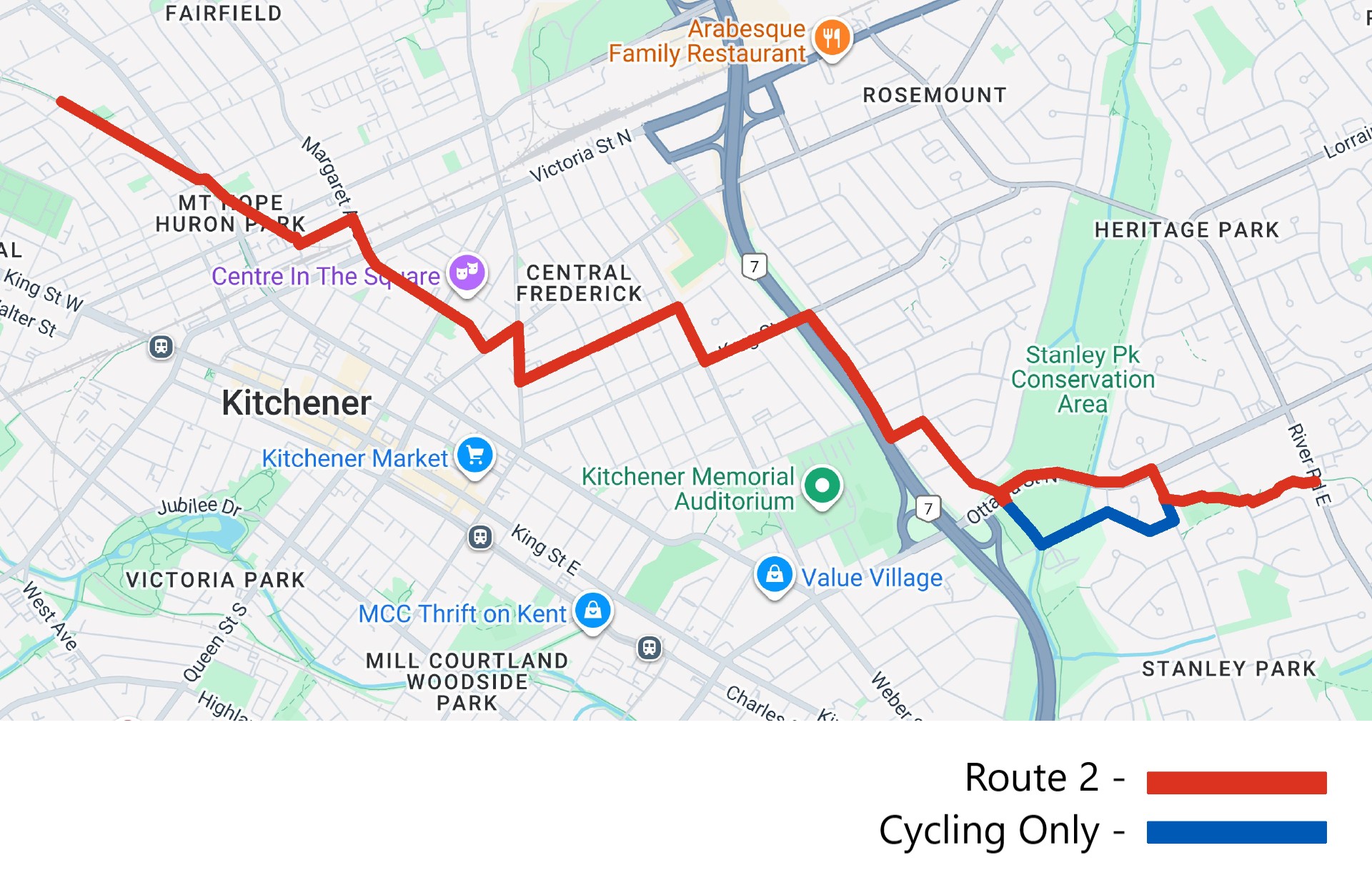 Community feedback recommended the Spurline Trail become part of this route, so city staff extended Route 2 to include the section between Downtown and Uptown. Major destinations between Stanley Park, Downtown and Uptown include Dom Cardillo Trail, Stanley Park Mall and GRT Station, Centre in the Square, Kitchener GO/VIA station and Spurline Trail.