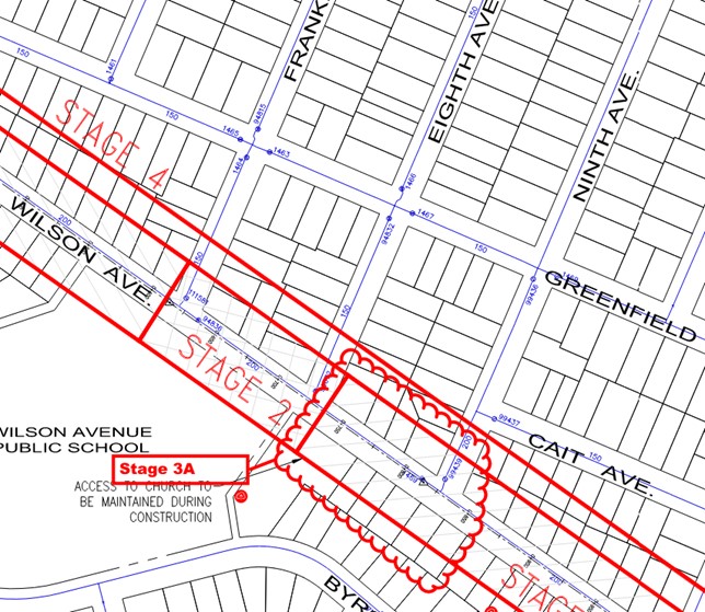 We will begin installing all the surface works on Wilson Avenue between Eighth Avenue and Ninth Avenue starting Nov. 8, 2024. Crews will start with stringline setup for concrete curb installation followed by curb placement, sidewalks, driveways, road (base asphalt) and landscaping.