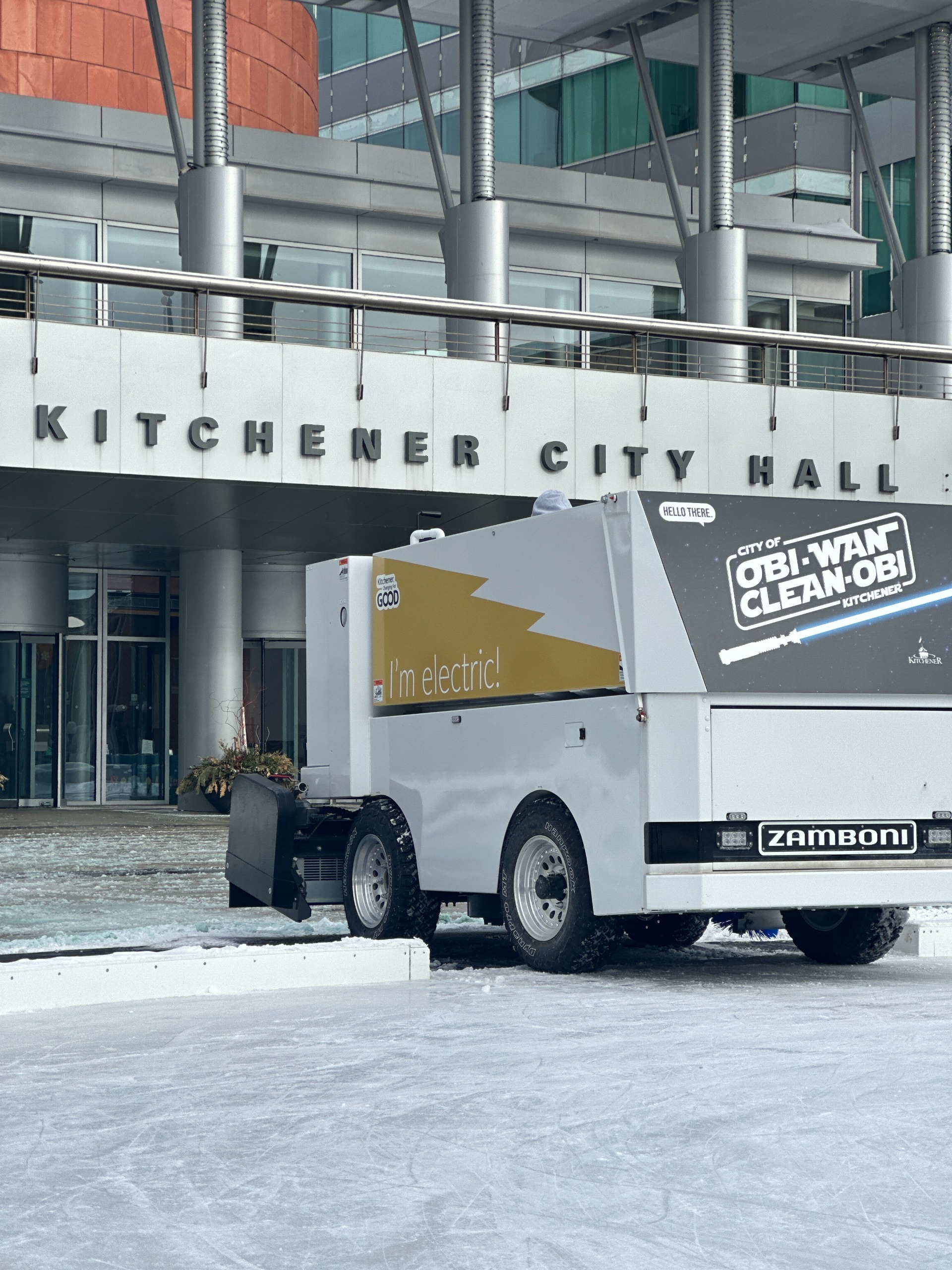 We are delighted to announced the winning name: Obi-Wan Clean-Obi! Thank you to Cat H. for suggesting this name. Take a look at a photo and video of the Zamboni in action below.